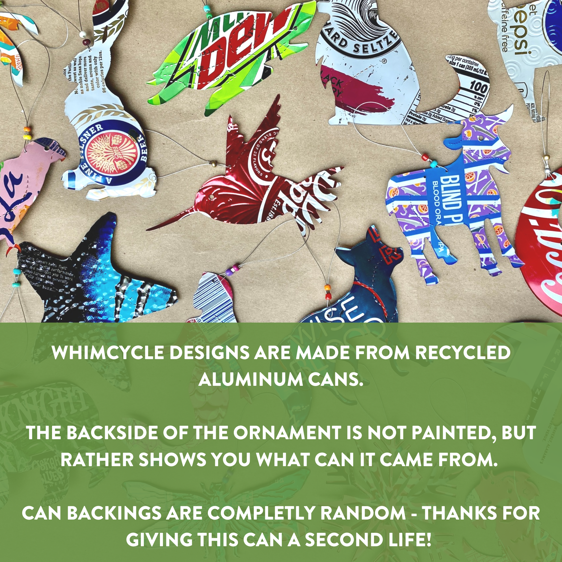 * Upcycled and repurposed aluminum can dog ornament.