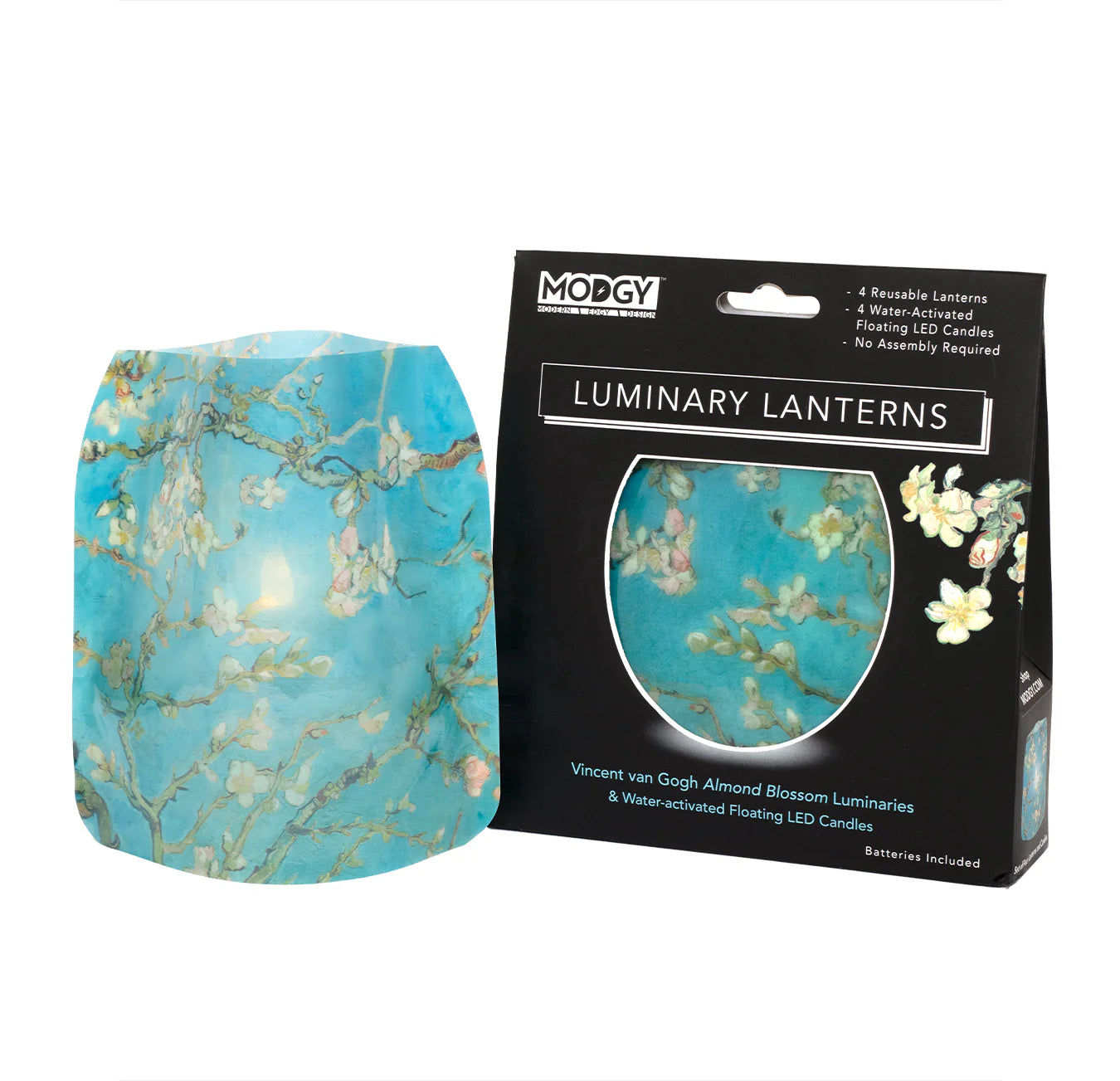 Included: 4 luminaries, 4 LED candles and 4 Lithium batteries per package. Luminaries arrive flat and expand with water.