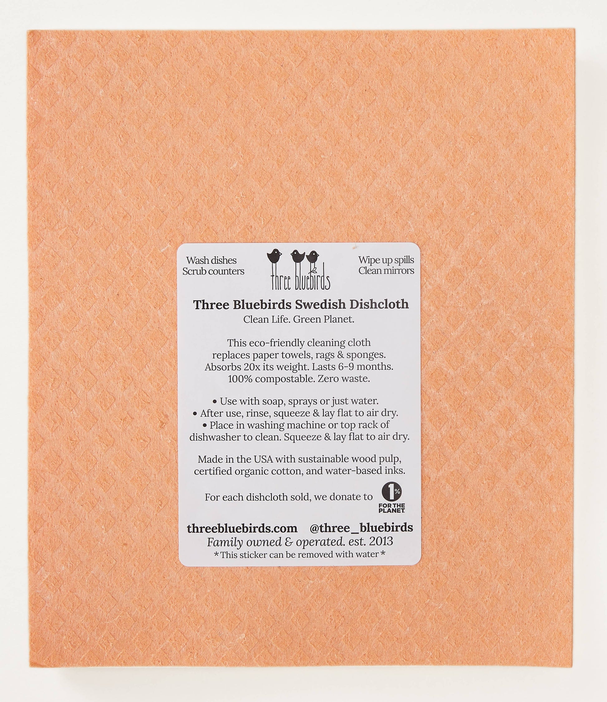REDUCE WASTE with our Swedish Dishcloth – it’s sustainable, sturdy, and stylish. Each cloth absorbs 20x its weight, replaces 17 rolls of paper towels. ---- CONTENTS: 70% cellulose (FSC-Certified). 30% organic cotton (FairTrade & GOTS). Screen printed with water-based inks. 100% biodegradable. Designed & printed in Connecticut ---- USE: Wash dishes. Wipe up spills. Clean mirrors. Use streak-free on most surfaces. Air dries fast, doesn’t breed bacteria like a sponge. ---- REUSE: Wash up to 200 times, in top rack of dishwasher or in washing machine. Sterilize in microwave or boil. We donate 1% of revenue to the Earth for each dishcloth purchased, as a “1% for the Planet” business. CLEAN LIFE. GREEN PLANET. MADE WITH LOVE.
