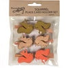 A set of six wooden place card holders displaying squirrel shaped designs in various fall colors on each. Holders feature natural wood pieces attached to clothespins that hold customized place cards and free-stand on flat surface. Place cards not included. Our Squirrel place card holder set comes packaged together in a polybag with header card. A fun set of tabletop accessories perfect for customizing seasonal place settings.