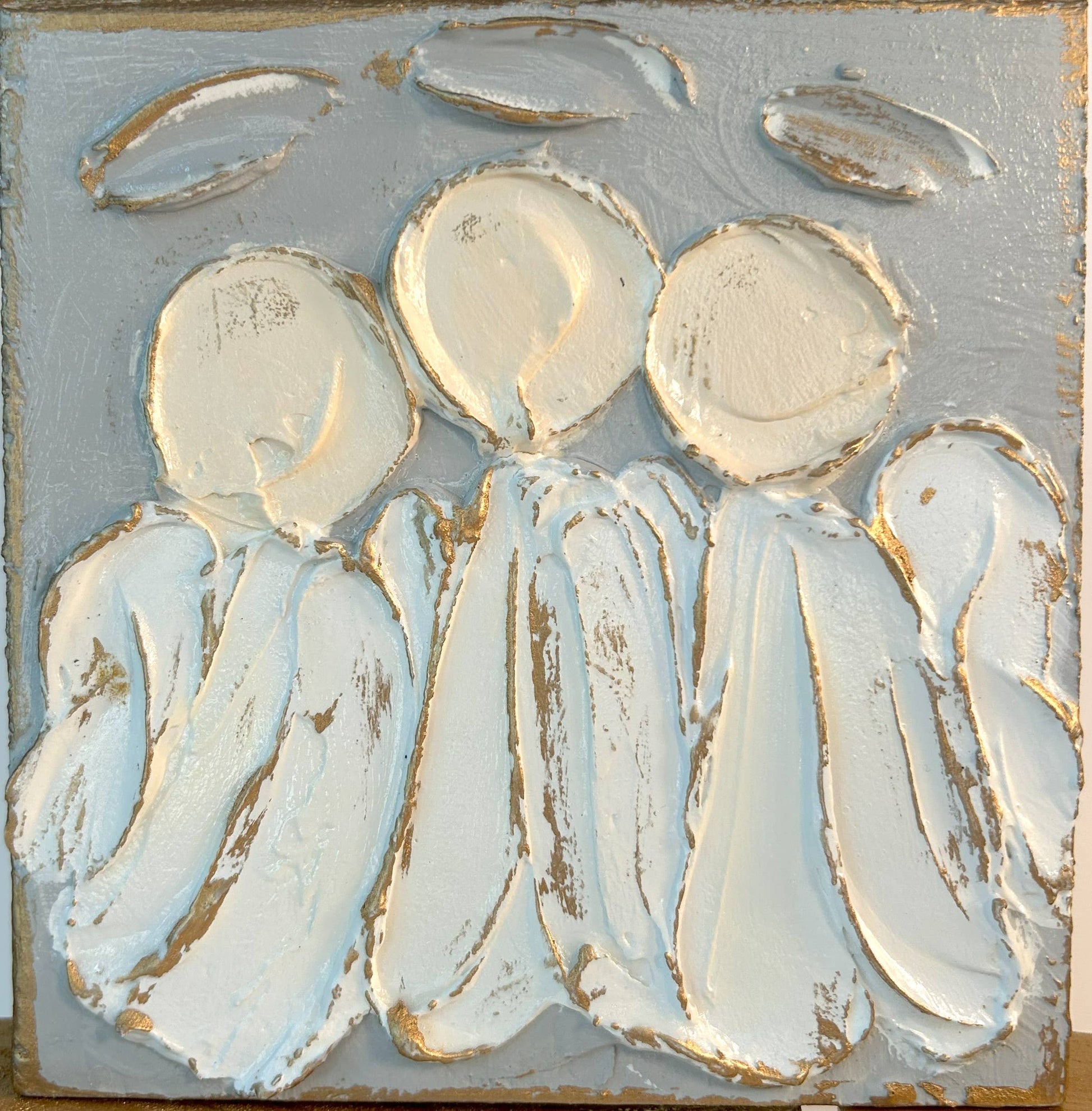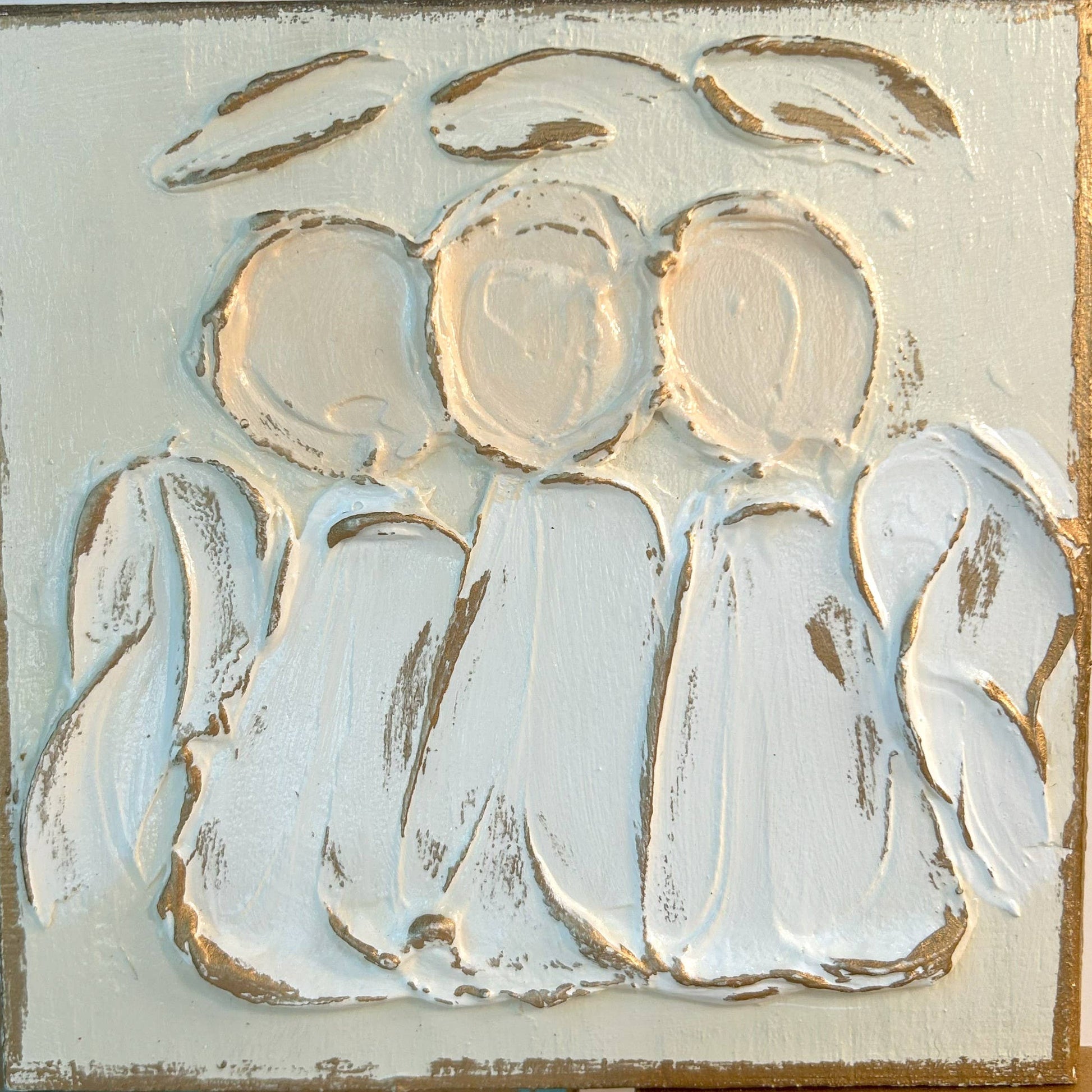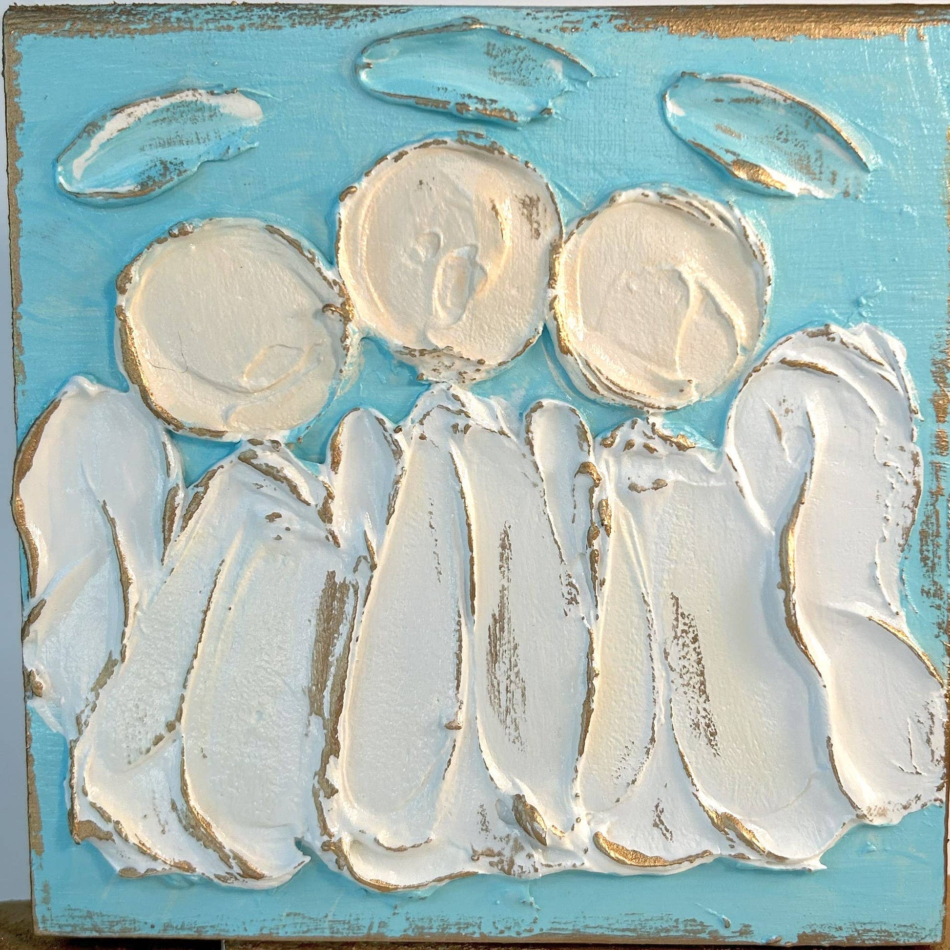 These sweet little handmade, textured angels are on 5x5 wood blocks. The celestial trio is dressed in white, trimmed with gold. Choose from three background colors: ivory, gray, or blue.