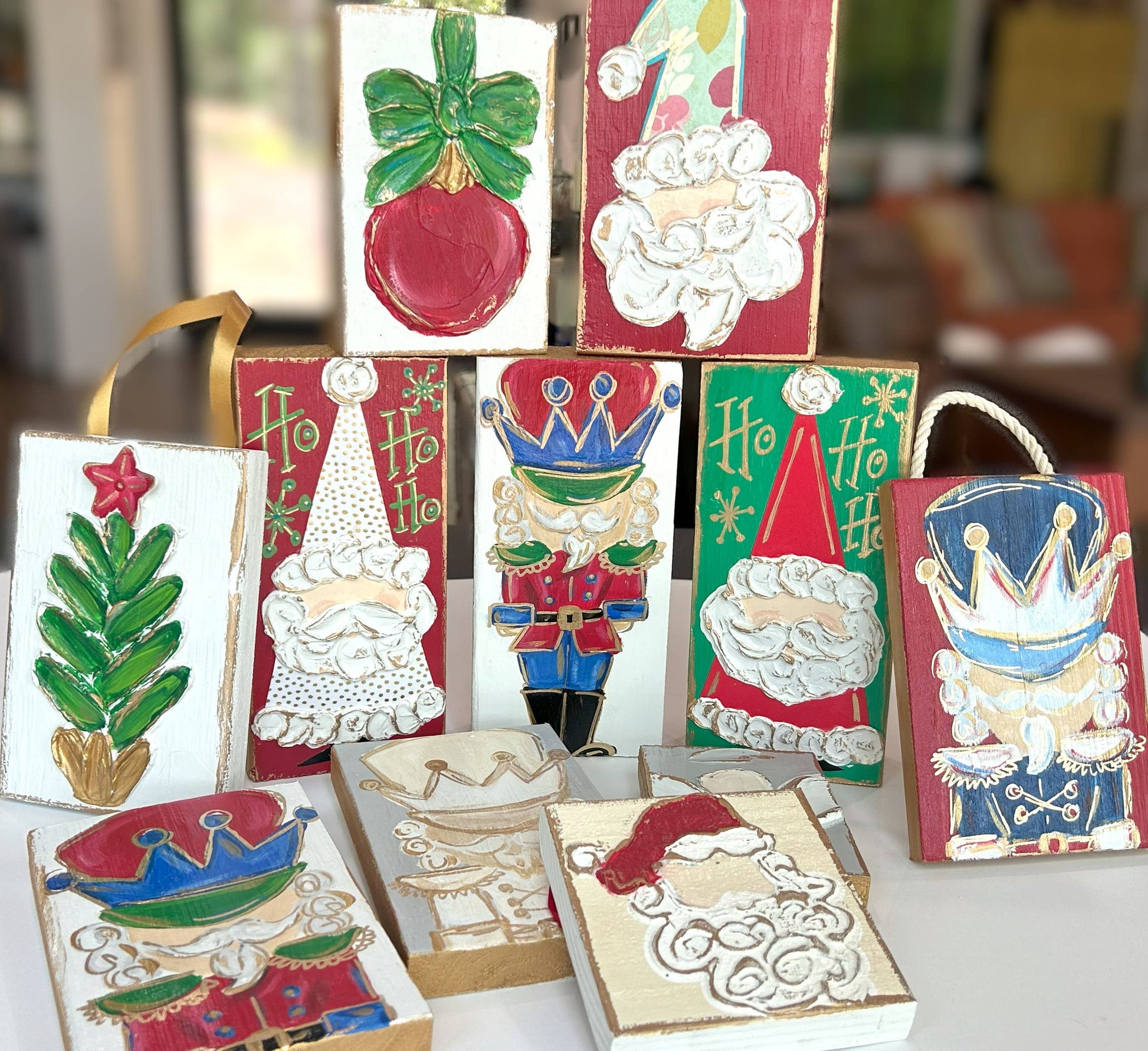Deck the Halls and trim the tree with pop and whimsy this season. These oversized 4x6 wood panel "ornaments" with gold ribbon hangers are hand textured and painted on thick, self-standing 3x5-inch wood blocks. Artist signature and company name are included on the back. Because each design is individually drawn and textured, each block is unique and will vary slightly.